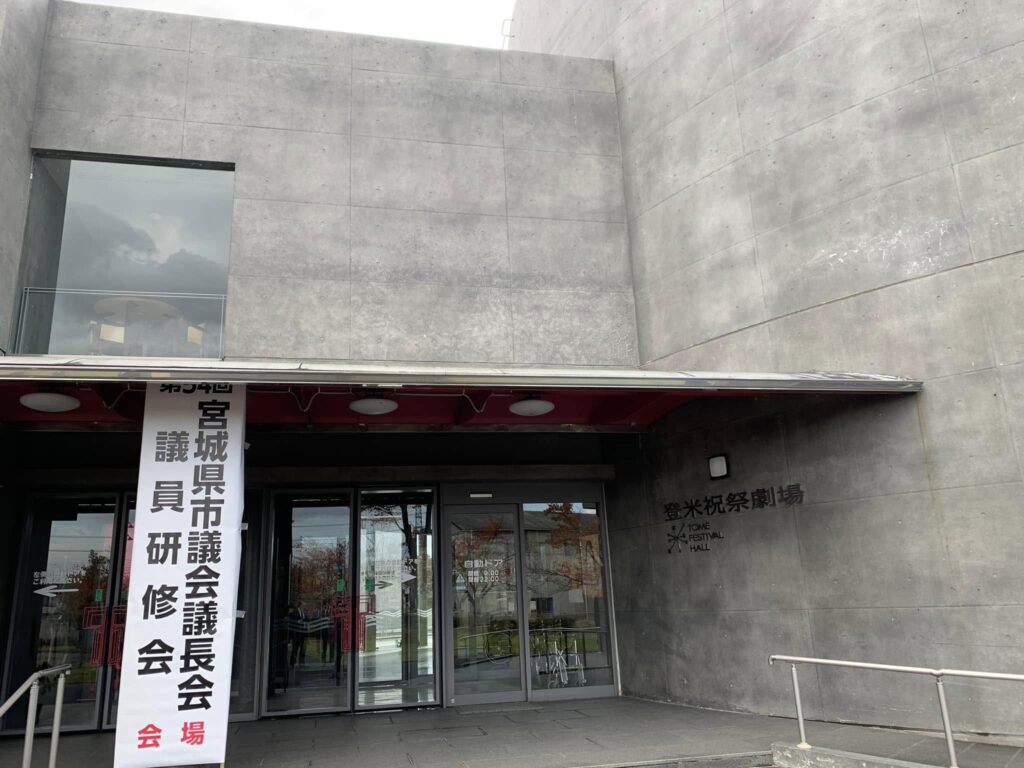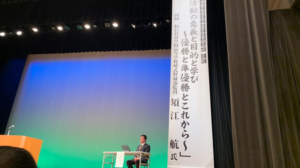 本日は宮城県市議会議長会議員研修会が登米の祝祭劇場で行われ、仙台育英学園高等学校硬式野球部監督の須江航先生による講演が行われました。